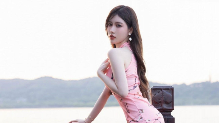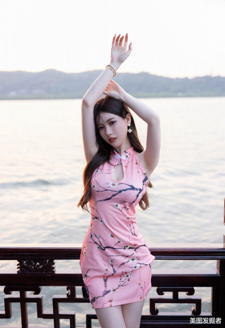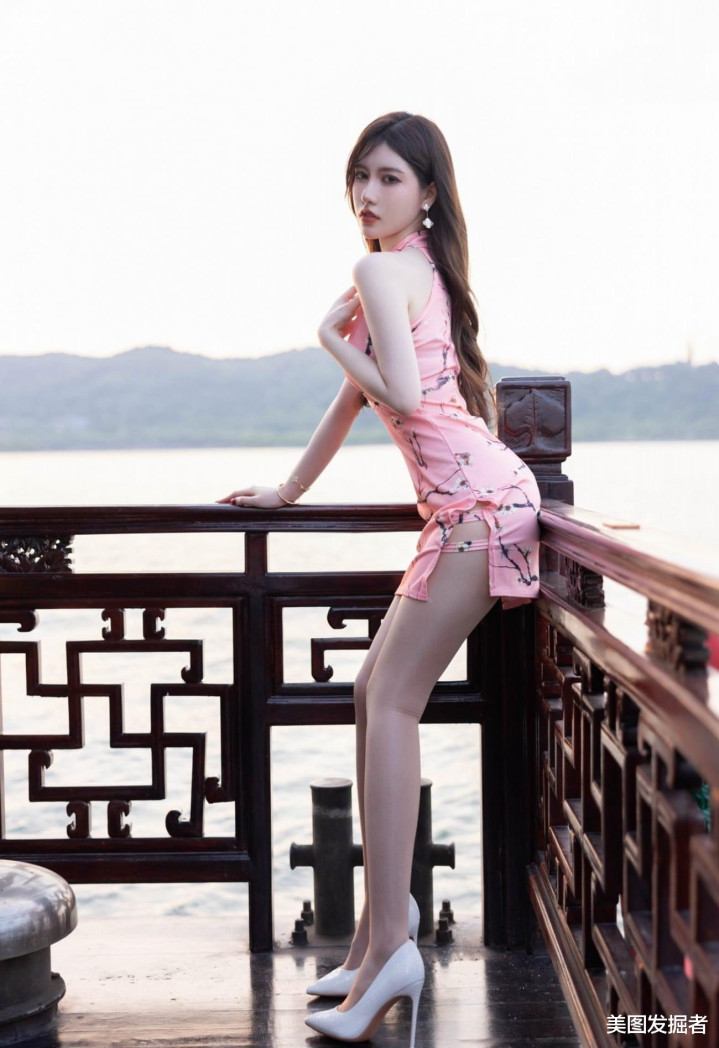 粉嫩旗袍紧裹曲线,无袖裁剪展露天鹅颈与肩峰,高开叉下修长美腿若隐若现,薄纱白袜衬得足踝如凝脂。她手持青花团扇轻摇,扇面梅花与裙摆印花相映成趣,娉婷立于湖畔石阶,将古典韵味与性感风情揉成一身潋滟。